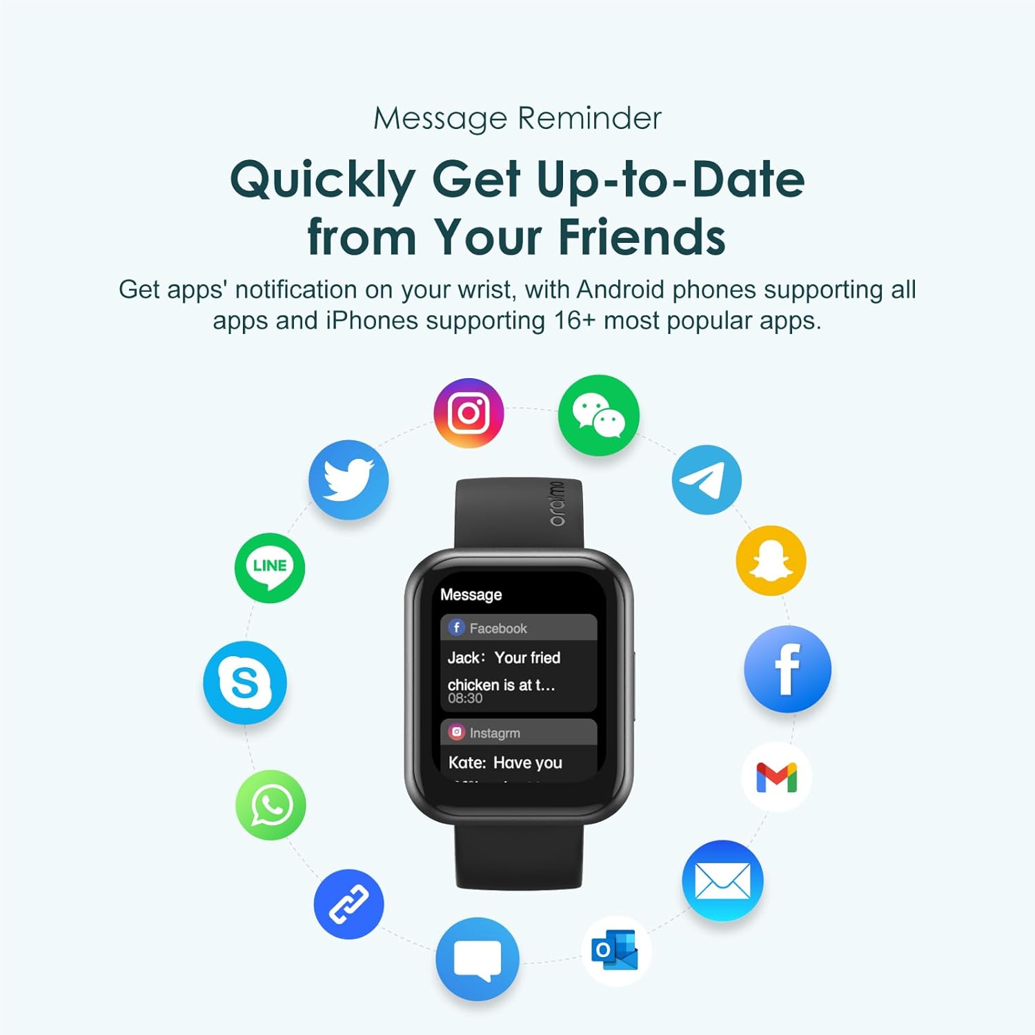 • 【Message Reminder – Quickly Get Up-to-Date from Your Friends】Get apps’ notifications on your wrist, with Android phones supporting all apps and iPhones supporting 14+ most popular apps.